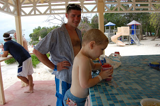 Monday morning we woke up and were in Nassau, Bahamas. We went to the buffet for breakfast and quickly changed into our swimsuits to meet up for our Blackbeards Cay Beach and Stingray Adventure. We disembarked the ship and took a little walk through Nassau to a smaller boat that took us out to Blackbeards Cay. Once there we got our snorkeling equipment and headed to the stingray beach. The water was way to chilly to actually snorkel, although there were a few brave souls that hopped in. We basically just waded in the water as stingrays swam around us. John and I both got to pet one, but none of them ever came close enough to Mike. They were very slimy feeling, and much bigger than I had anticipated. John wasn't very interested in them, so we took him over to the regular beach.